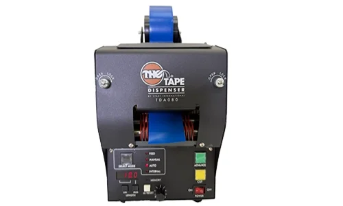 Dieser kompakte Spender schneidet automatisch kurze Klebebandstücke (ab 15 mm) und platziert bis zu 20 Stücke gleichzeitig greifbar auf einem rotierenden Karussell. Ideal für Multi-Operator-Arbeitsplätze – sobald ein Werker ein Stück Band abzieht, schneidet die Maschine dank Lichtschranke automatisch ein neues nach.